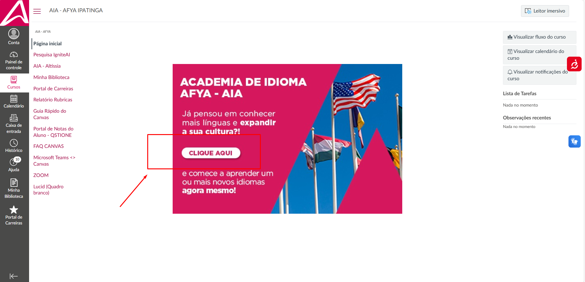 1. Para acessar a AIA basta fazer login no canvas e na aba de cursos clicar em "AIA - AFYA IPATINGA"